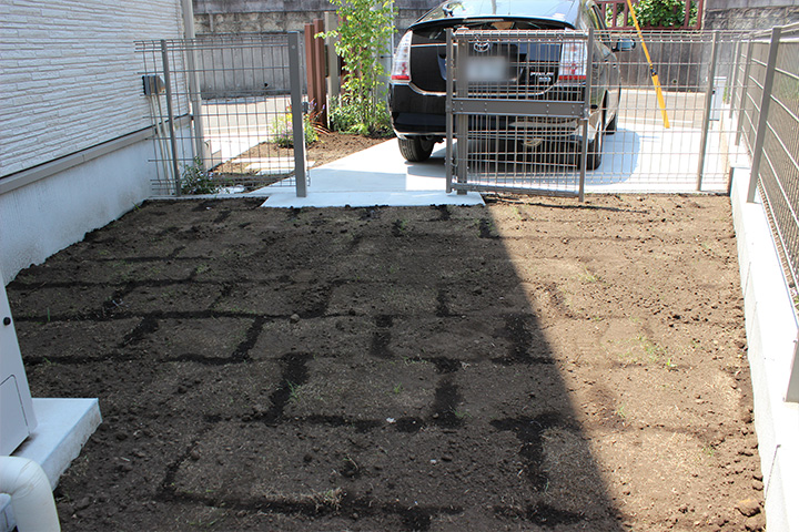 芝生は管理がしやすいTM-7を使用しました。愛犬達が自由に遊ぶにはもう少しお時間を頂く事になりますが、美しい芝生のドックガーデンになることは間違いないありません。