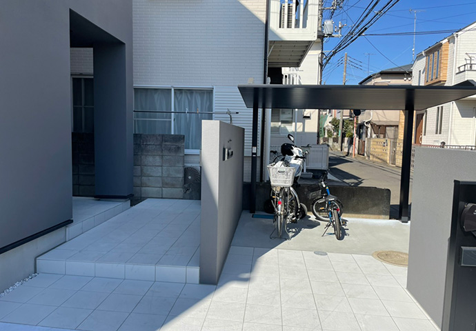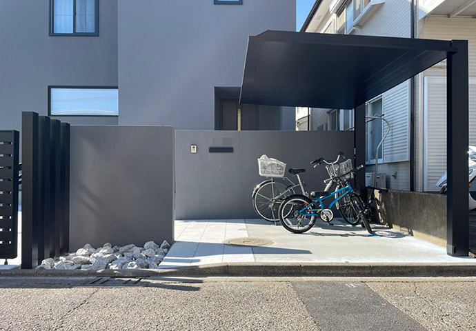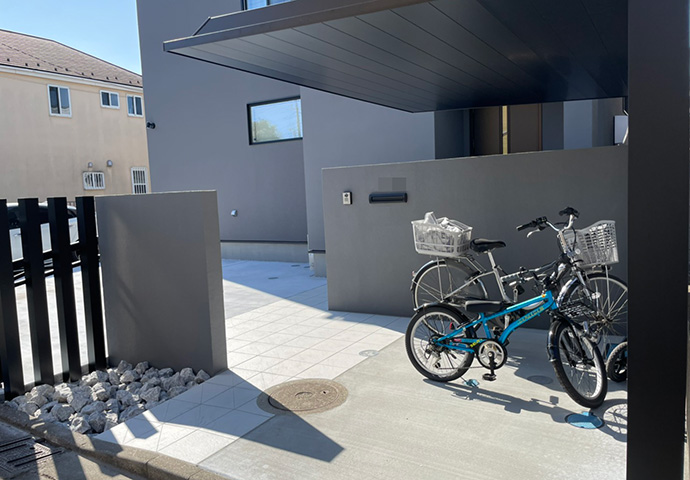 サイクルポートとスリットフェンスのブラックが空間を引き締めてくれます。