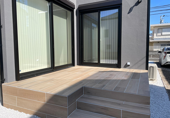 木目調タイルをつかったタイルデッキは、柔らかい印象です。