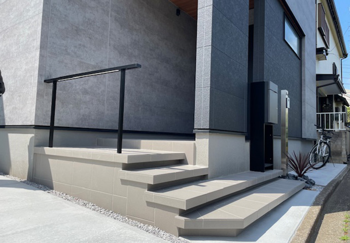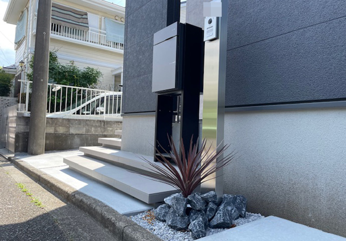 フローティングステップを家の基礎を巻き込むようにデザインして、その先にポストとインターホンを設置しました。