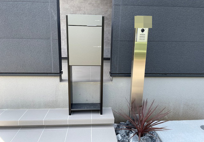 玄関前から離れた場所にインターホンポールを設置しましたが、つながりのあるデザインで、離れて設置していても違和感がなくなります。
