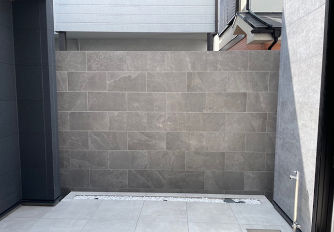 目隠し塀は発泡材の下地にタイルを貼った近年流行りの外構素材です。地震などで万が一倒壊しても、ベースが軽いので安心です。