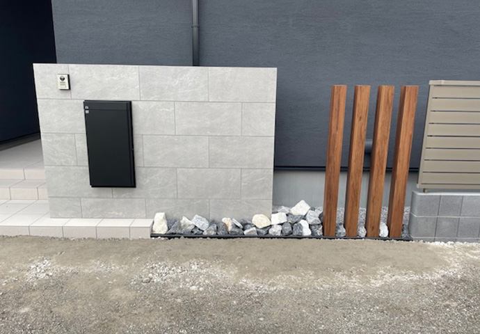 見にくい裏側にもタイルを貼るこだわりが、シンプルな外構では光ってくるポイント。