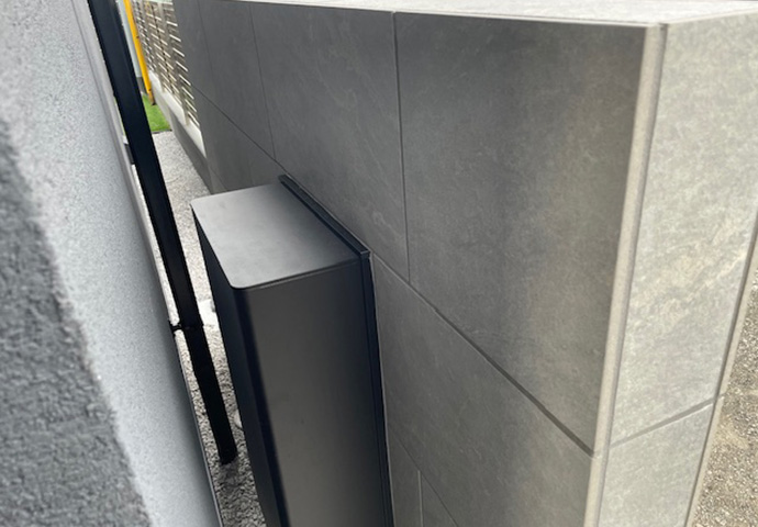 モノクロな自宅に馴染む、大きな門袖には、グレーの大判タイルを貼りました。