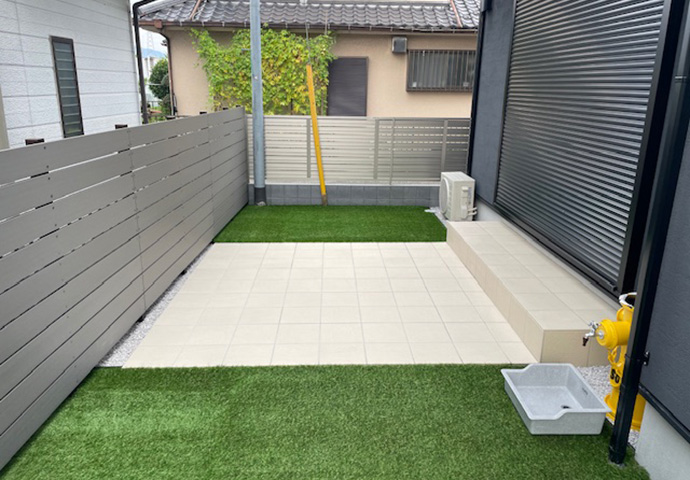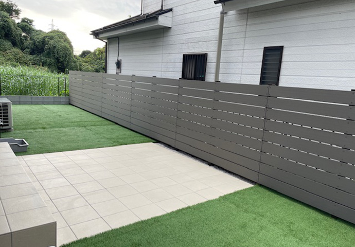 庭側には、人工芝とタイルデッキ、樹脂製の目隠しフェンスを。