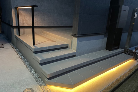 フローティング加工された階段が印象的な玄関ステップ