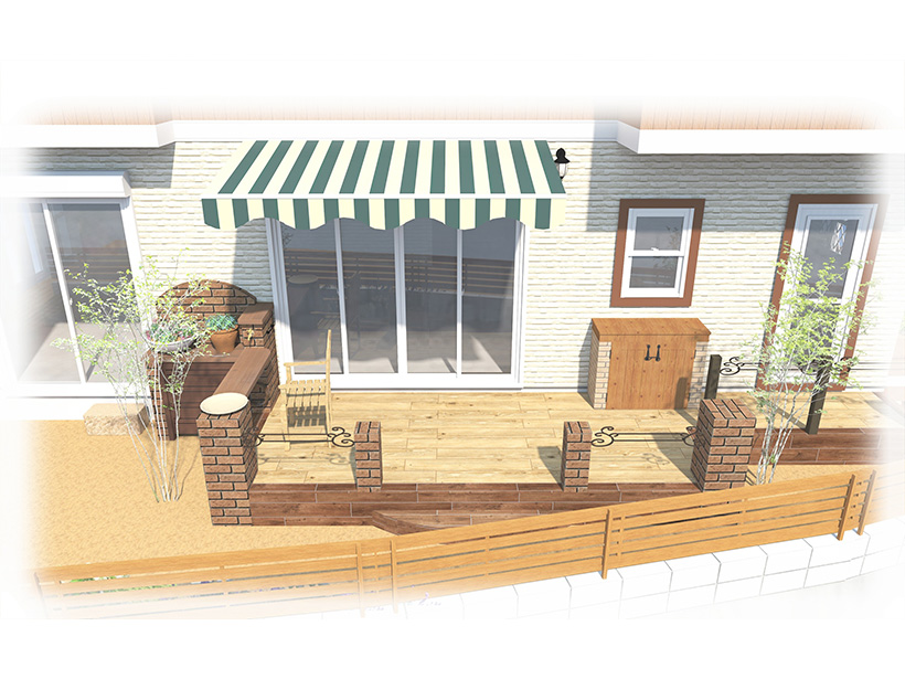 独立のオーニングとタイルテラス、高さのある目隠しフェンスで、ゆっくりと過ごせるお庭のプランです。