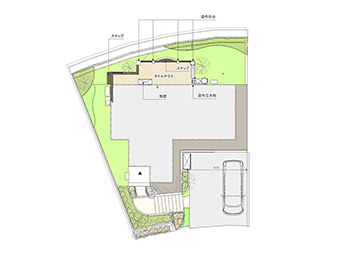 - 斜めに確保した駐車スペースですっきりとしたオープン外構へ