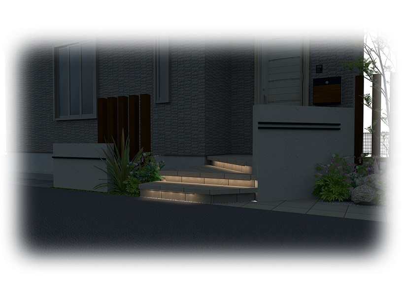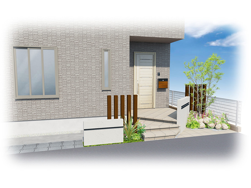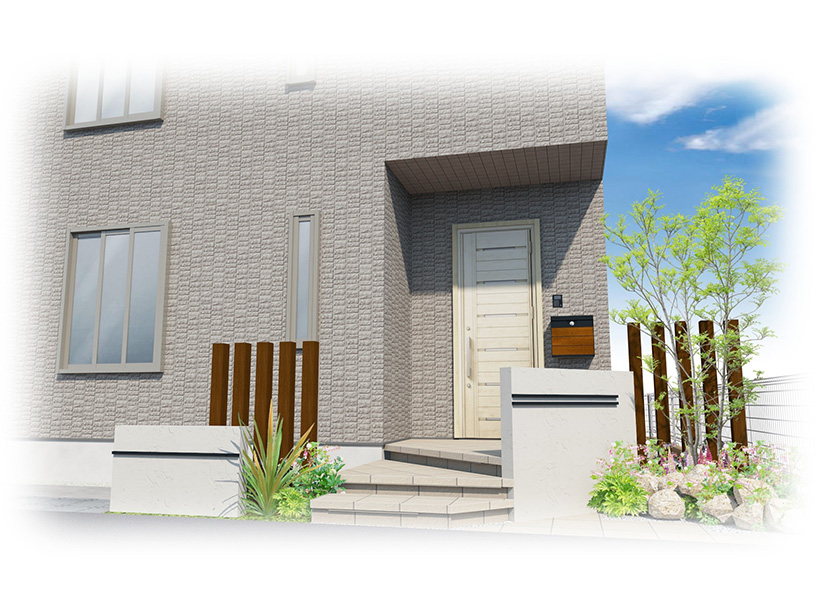 ポストや照明・石材など、スタイルに合わせた商品が各メーカーより販売されていますので、プレゼンの段階ではCAD(3Dイメージ)を使い分かりやすくご説明。門周りやアプローチをイメージして頂けます。植物を組み合わせることによって、さらに思い描いているエクステリアスタイルを完成させることが出来ます。