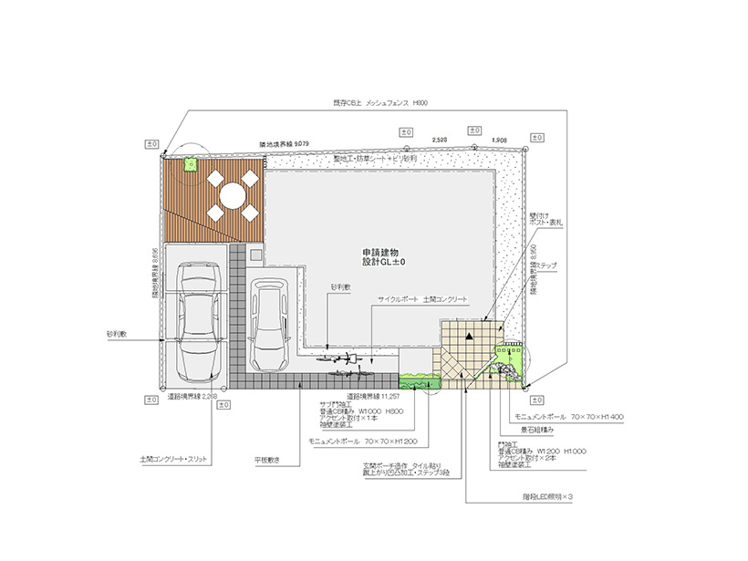 駐車場は2台分確保したいけど普段は1台しか停めないので、車がない時は庭の一部と見えるようにしたい。という要望があったオープン外構プランです。